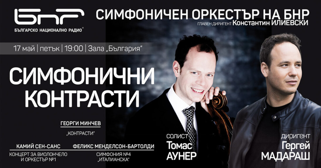 Томас Аунер и Гергей Мадараш ще гостуват за пръв път на Симфоничния оркестър на БНР в концерта "Контрасти" на 17 май в зала "България". Популярни и контрастни произведения ще предложи богатата програма, с която Радиосимфониците ще отбележат 85-годишнината на акад. Георги Минчев – един от най-ярките представители на съвременната българска музика, който я утвърждава на международната сцена. Гост-диригент ще е маестро Мадараш – музикален директор на Кралския филхармоничен оркестър на Лиеж, а солист ще е Томас Аунер – водач на виолончелите на Брукнер оркестър в Линц.
