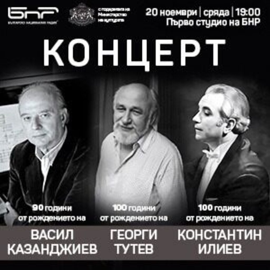 Камерен концерт в Първо студио на БНР ще почете три важни годишнини, които честваме през 2024 г. На 20 ноември, сряда, от 19.00 ч. ще прозвучи музика по повод 100-годишнината на от рождението на Георги Тутев и Константин Илиев, както и на 90-годишнината на доайена сред българските композитори акад. Васил Казанджиев. На сцената ще са признати музиканти от различни генерации, обединени от идеята чрез авторската музика на тримата големи композитори да почетат значимия им принос за популяризирането на съвременната българска музика и съизмеримото им място в европейското и световно музикално творчество.