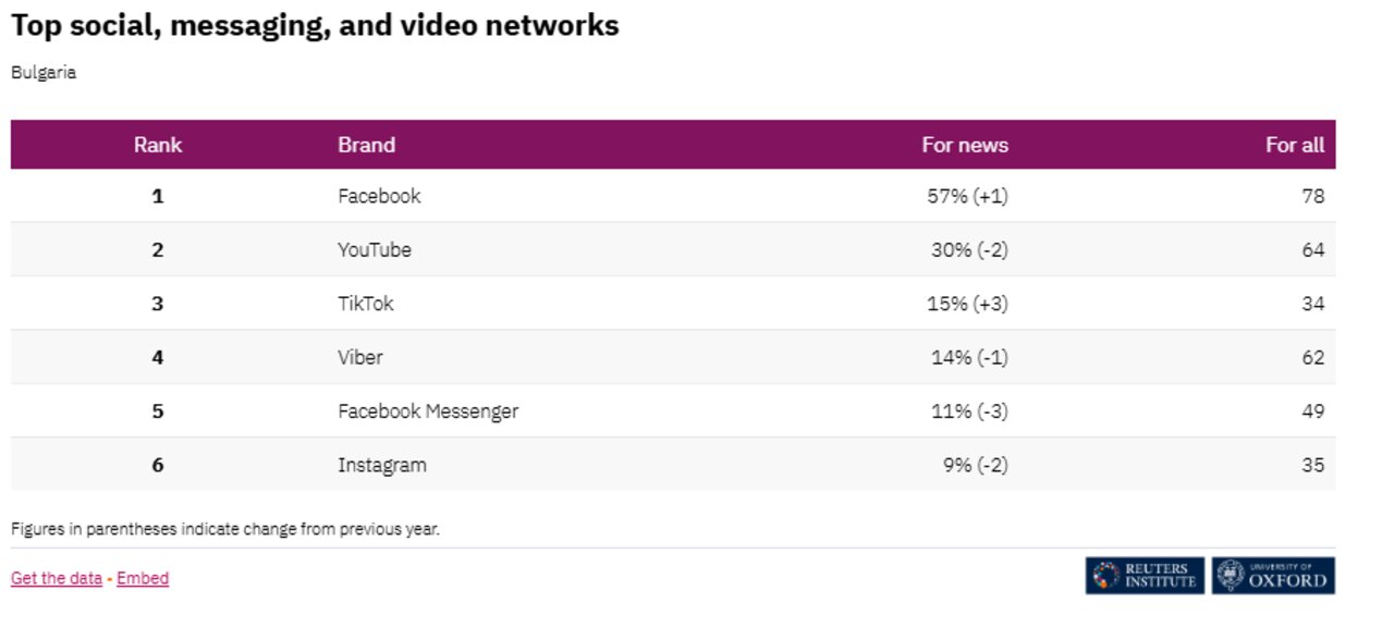 Със 78 % Facebook остава най-използваната социална медия в България, като 57 % научават новините от нея. YouTube е на второ място със 64%, като за 30% тя е източник на новини. По-младите българи научават новините основно от TikTok, която е на трето място с 34 % общо и 15 % като източник на новини.