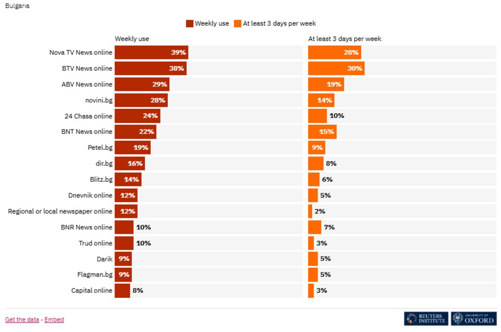 С 3% спрямо миналата година спада общото доверие в новините. Променливостта на политическата среда вероятно допринася за продължаващото намаляване на доверието в новините в България, сочи анализа в доклада и посочва, че в страната ни се отчита най-високото ниво на избягване на новини (63%).