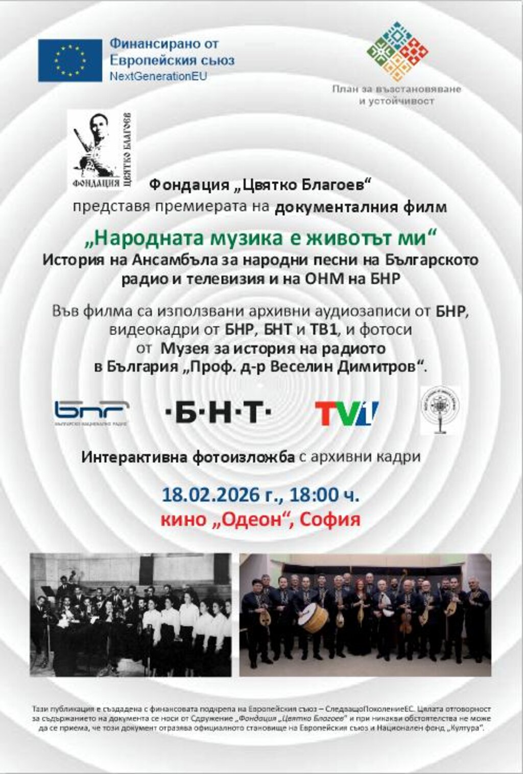 Премиерата на документалния филм "Народната музика е животът ми" предстои днес в кино "Одеон". Гост в студиото на "Нашият ден" е неговият режисьор, Радка Стаменова. Филмът проследява историята на Оркестъра за народна музика на Българското национално радио от основаването му до наши дни.