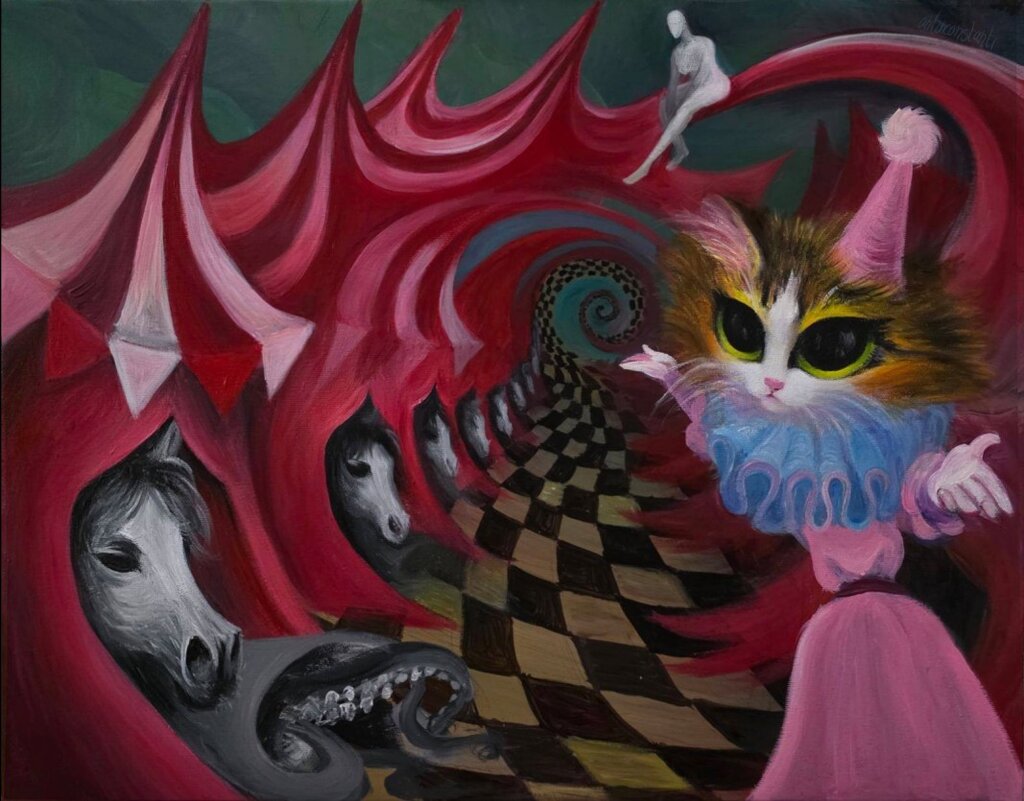 The world created by the artist is beautiful, colorful, enchanting, but at the same time, something seems to whisper to us to be careful about what lies behind the apparent calm, so as not to end up on the other side, where the person can be dismembered and thrown on the road.
