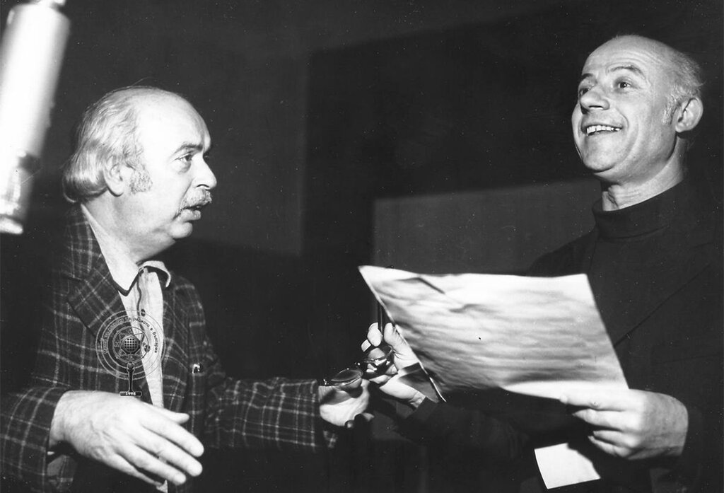 Petar Stupel and actor Emil Stefanov recording the children's programme "Barborino" on the Bulgarian National Radio