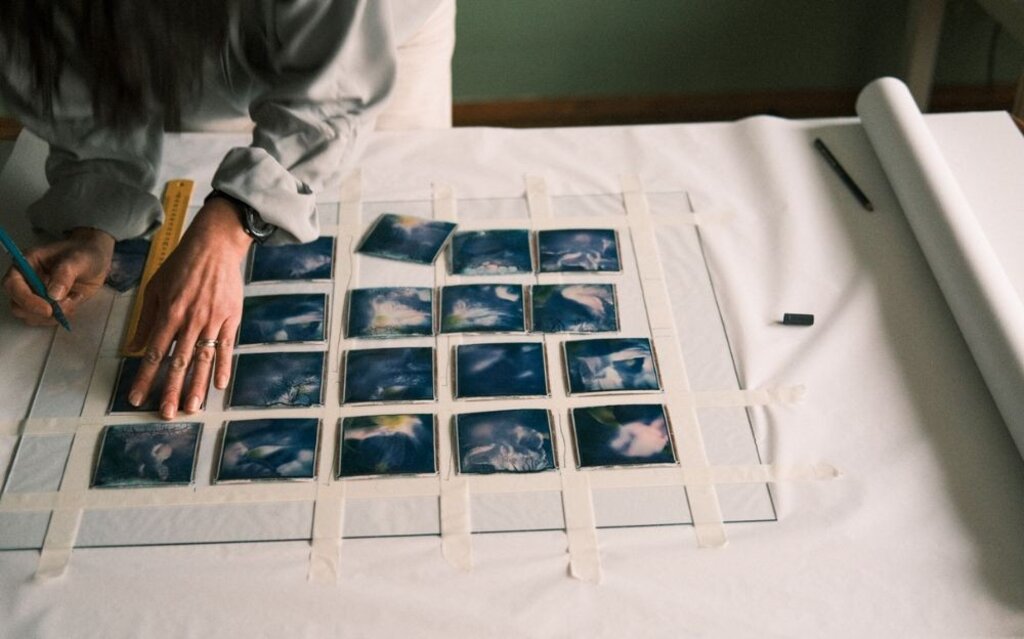 Para aportar fuerza y color, e incluir los espacios para los mensajes codificados en cada fotograma, la artista utiliza una vieja Polaroid. Algunas de las piezas las deja envejecer en botes de agua y detergente, y otras las cuece en una olla junto con trozos de remolacha. "Me gusta mucho ese suave elemento de herida, y de desenfoque, que dificulta al espectador a la hora de descifrar la imagen y le da la libertad de asomarse dentro de sí mismo", añade Johana. Otro hilo conductor para lograr este efecto, son las pinturas sonoras de Deyan Tsviatkov, que acompañan a las fotografías y que representan una parte fundamental del espacio audiovisual de esta exposición, cuyo propósito es, a fin de cuentas, “sumergir” a su público en el mundo que recrea.