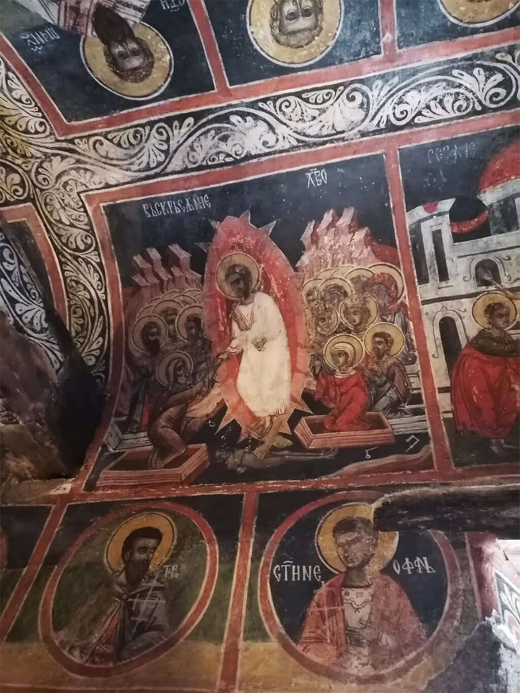 Es curioso además el número de las imágenes de santas, que superan la treintena. La iglesia también es única por su fresco de la escena de la Transfiguración, donde Jesucristo aparece representado en algo parecido a una nave espacial.