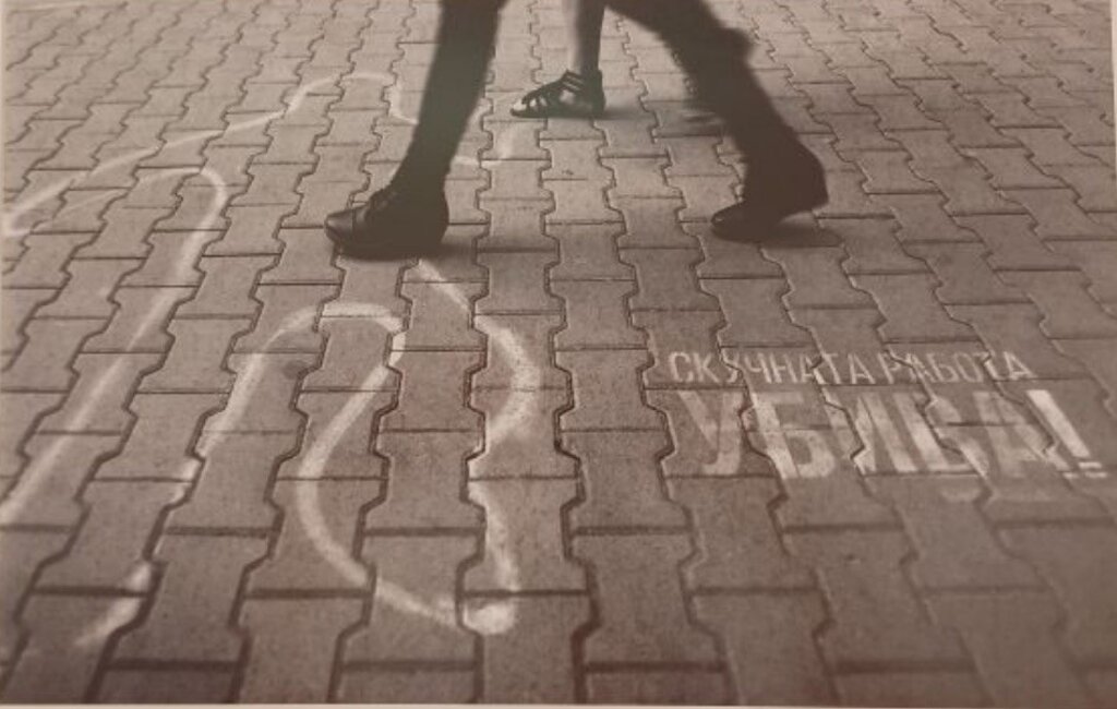 “Aquí en la acera vemos la inscripción El trabajo aburrido mata, dice el autor ante una de sus fotografías. El lugar es la parada de autobuses detrás de la Universidad de Sofía. Estaba sentado en el banco y esperaba que alguien pasara para que la foto no se pareciera a una reproducción de la silueta pintada y del autor del texto".