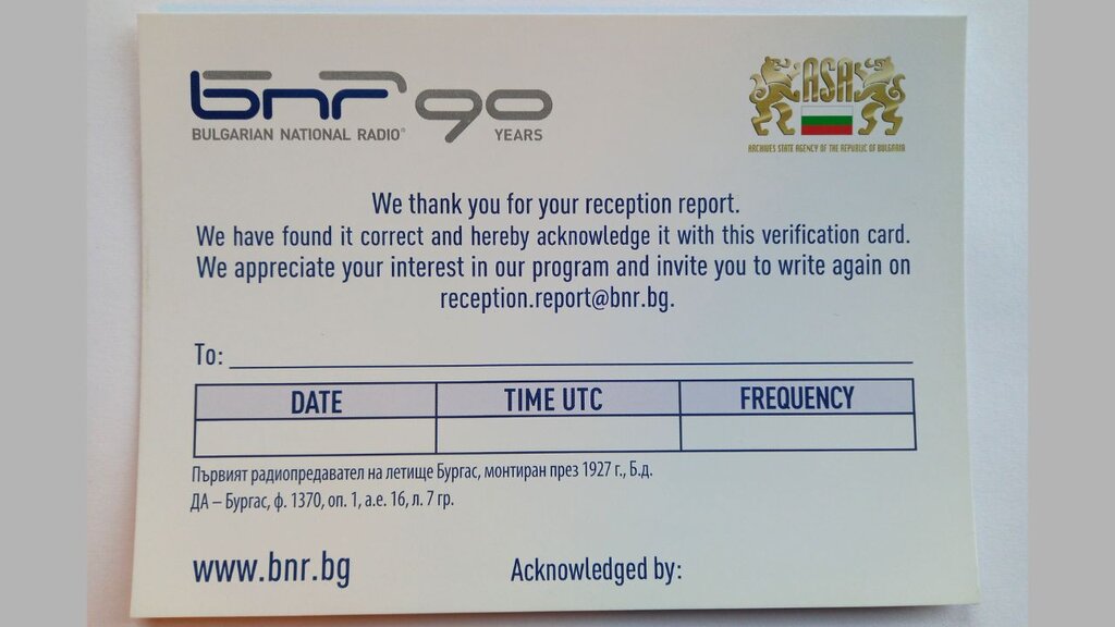 Con las QSL se confirman todos los programas escuchados de Radio Bulgaria y todas las señalas captadas en el éter de BNR (Horizont, Hristo Botev, los programas de las estaciones regionales en Sofía, Blagoevgrad, Burgás, Varna, Vidin, Kardzhali, Plovdiv, Stara Zagora, Shumen).