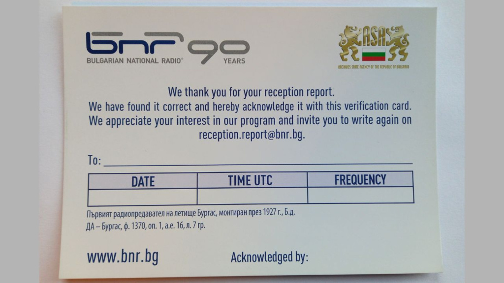 Nous avons le plaisir de vous annoncer l’opportunité de recevoir la série de 12 cartes QSL, dédiées au 90e anniversaire de Radio Bulgarie et de la Radio nationale bulgare, imprimées avec la gracieuse collaboration des Archives nationales.