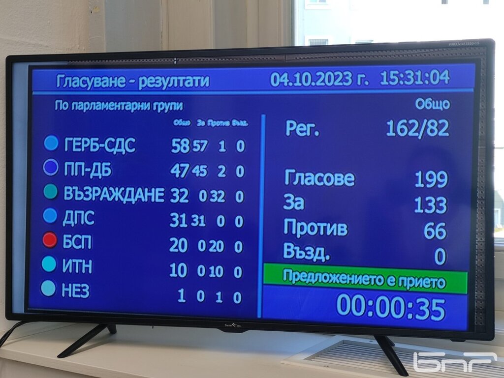 За гласуваха 133-ма депутати от ГЕРБ-СДС, ПП-ДБ и ДПС, а против - 66 от "Възраждане", БСП, ИТН и нечленуващият в парламентарна група Радостин Василев.