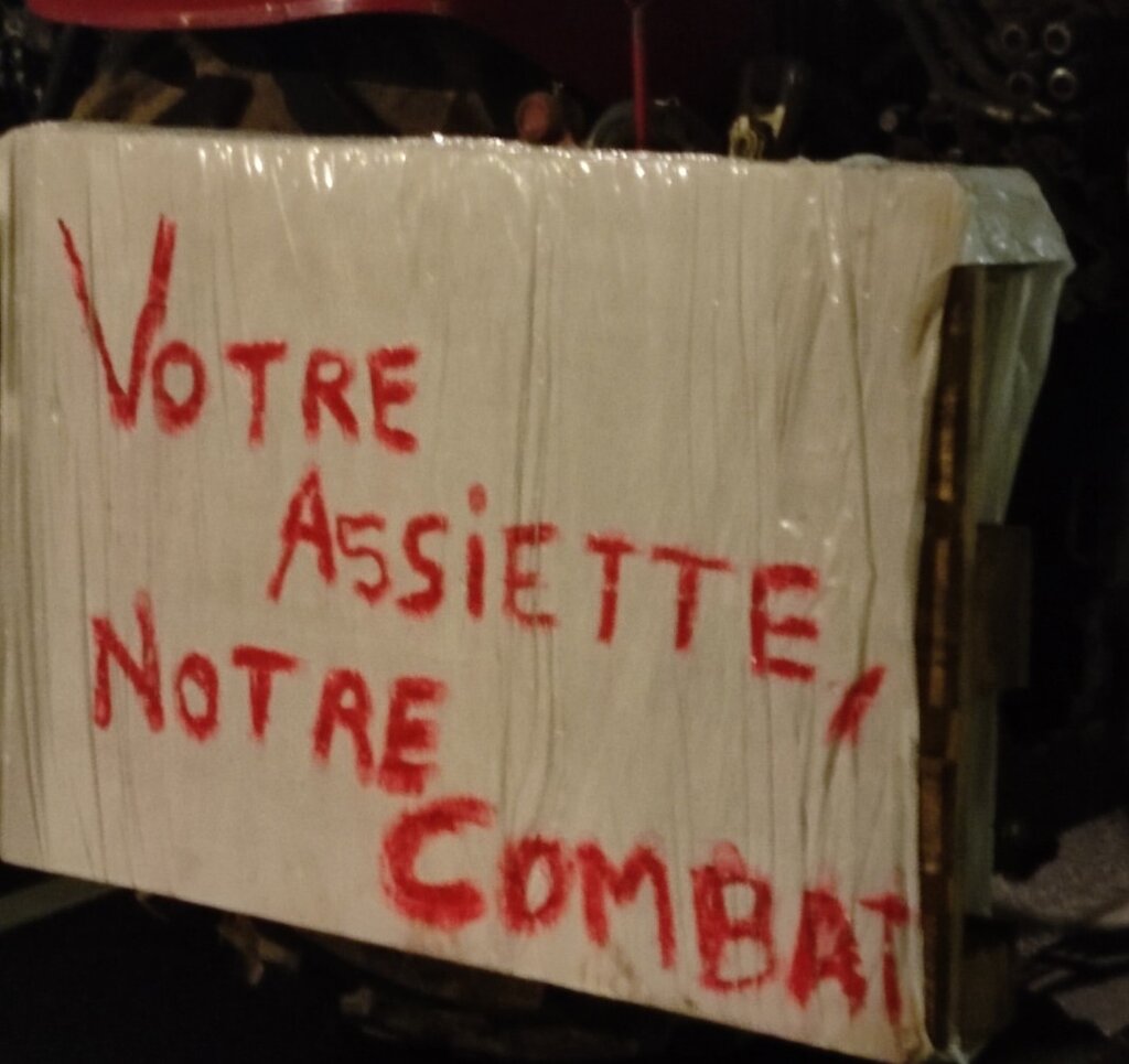 Един от надписите на тракторите гласи: "Вашата чиния е нашата битка".