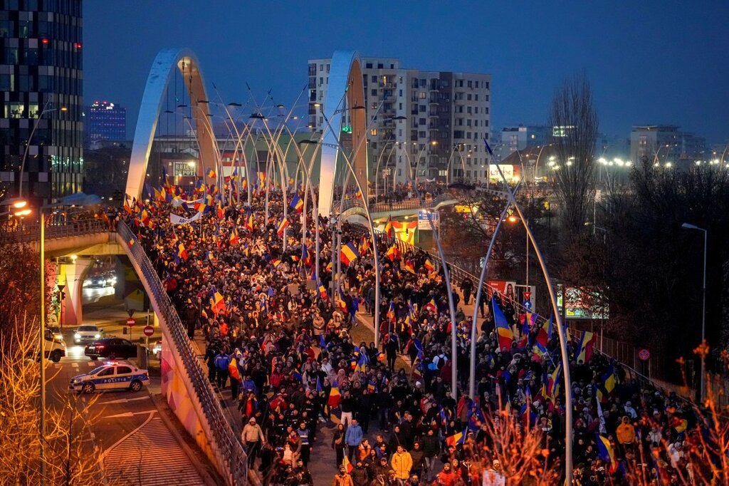 Десетки хиляди симпатизанти на опозиционния Алианс за обединение на румънците (АУР) се включиха в протест в центъра на Букурещ днес срещу анулирането на президентските избори през 2024 г., съобщават Аджерпрес, цитирана от БТА.