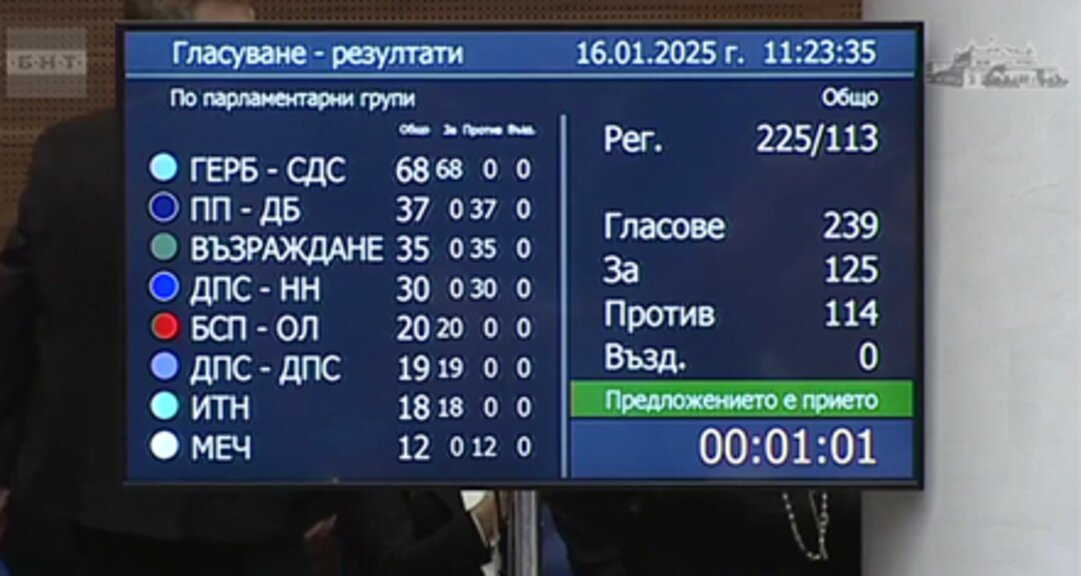 "За" правителството на ГЕРБ-СДС, БСП-Обединена левица и "Има такъв народ" гласуваха 125 депутати - от ГЕРБ-СДС, "Демокрация, права и свободи - ДПС", БСП-ОЛ и "Има такъв народ". "Против" бяха 114 депутати - от ПП-ДБ, "Възраждане", "ДПС - Ново начало" и МЕЧ. Нито един народен избраник не гласува с "въздържал се".