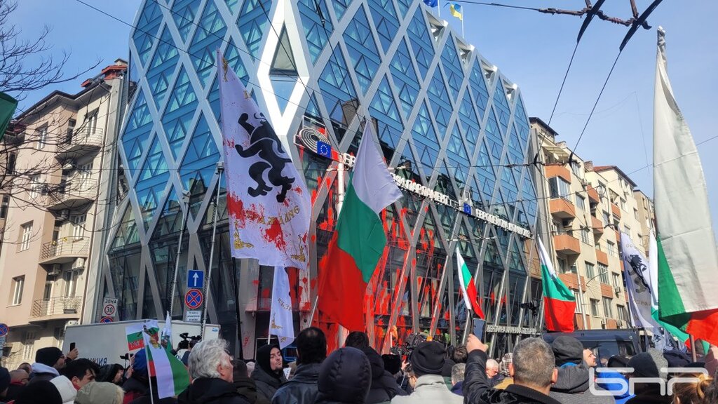 Участниците в протеста, организиран от партия "Възраждане", срещу въвеждането на еврото се насочиха с шествие към сградата на представителството на Европейската комисия в София. Стигна се до напрежение, след като протестиращите хвърлиха боя и се опитаха да подпалят вратата на сградата.