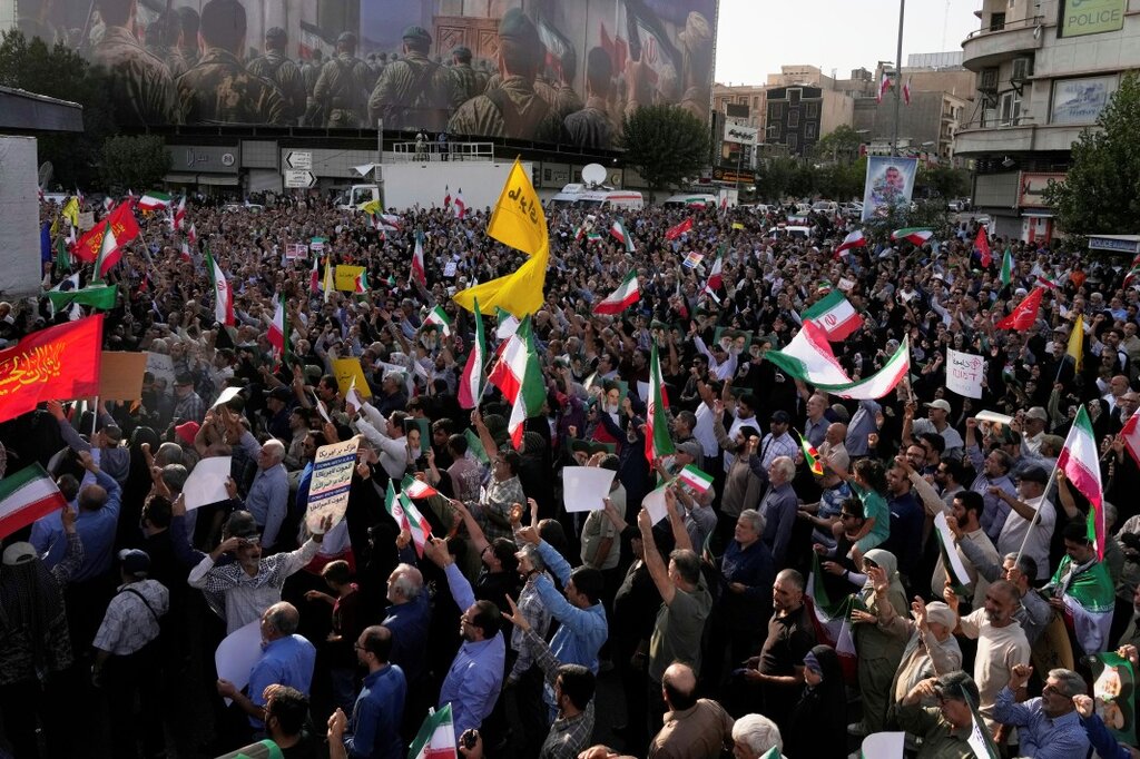 Кадри на държавната телевизия показаха как хиляди хора на Площада на Революцията в Техеран със знамена, с транспаранти, лозунги и портрети на върховния лидер на Ислямската република аятолах Хаменей скандират срещу САЩ и Израел.