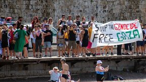 "Идваме с послание "Мир за Палестина" и почит към героите от флота "Сумуд", най-вече за героя, който представи България" - казва Мустафа, един от стотиците събрали се в подкрепа на Палестина. На много плакати като неговия се вижда името на Васил Димитров, който е част от флота.