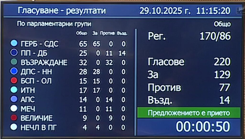 "За" гласуваха 129 депутати от ГЕРБ - СДС, БСП, "ДПС - Ново начало" и "Има такъв народ" и четиримата независими. ПП-ДБ се въздържаха, а "Възраждане", АПС, "Величие" и МЕЧ бяха против.