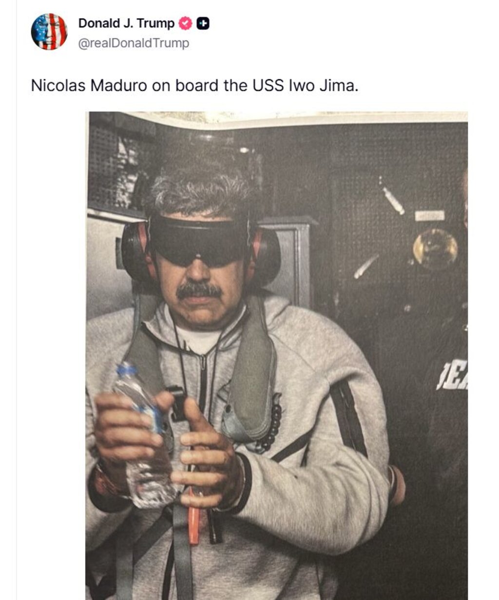 Президентът на САЩ Доналд Тръмп публикува в социалната си медийна платформа Truth Social снимка на венецуелския президент Николас Мадуро с белезници на ръцете.