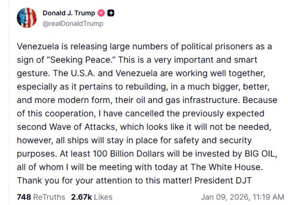 Президентът на САЩ Доналд Тръмп обяви в петък в своята социална медийна платформа Truth Social, че е отменил планираната втора атака срещу Венецуела след сътрудничество от страна на южноамериканската държава.