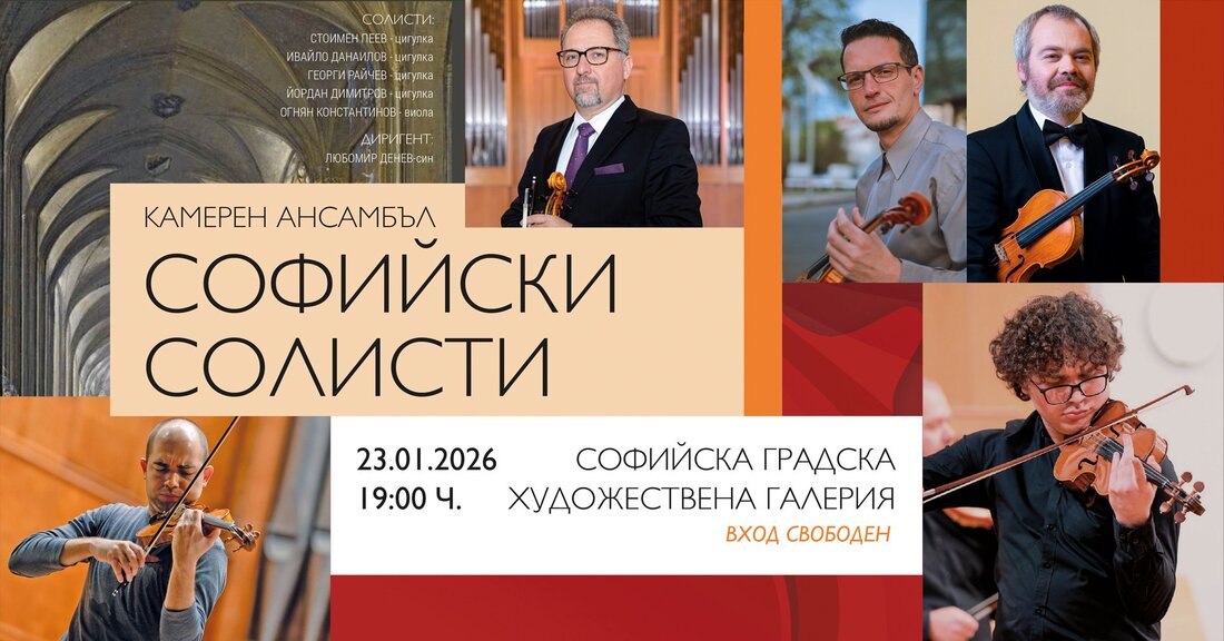 На 23 януари от 19:00 ч. в Софийската градска художествена галерия концерт ще изнесе камерният ансамбъл "Софийски солисти", воден от главния си диригент Любомир Денев-син.