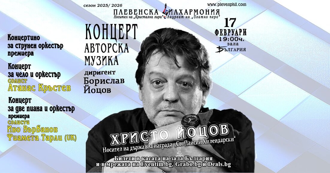 На 13 февруари от 19 ч. в зала "Катя Попова" в Плевен и по традиция на рождения ден на маестро Христо Йоцов – 17 февруари, от 19 ч., в зала "България" в София, Плевенската филхармония ще представи 2 концерта с негова авторска музика.