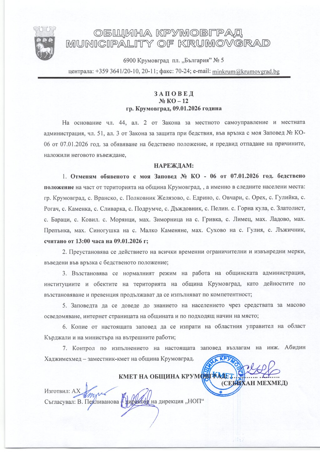 Отменено е частичното бедственото положение в община Крумовград. Водоснабдяването във всички население места е възстановено, с изключение на село Златолист, където има съмнение за скъсан водопровод.
