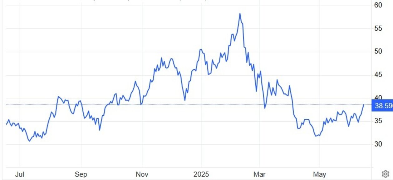 Графика на газовите TTF фючърси (в евро за мегаватчас)