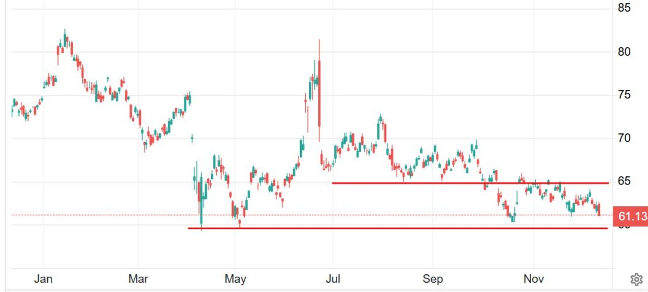Към 17.00 часа българско време фючърсите на петрол Брент се понижават с 1,7% към 61,15 долара за барел, а тези на американския лек суров петрол WTI - с 1,8% към 57,40 долара за барел.