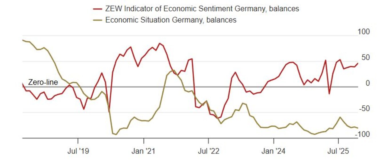 В същото време оценката за текущата икономическа ситуация в Германия остава в силно негативна територия, като съответният индекс се понижи до -81,0 от -78,7 пункта, достигайки най-ниско ниво от май насам.