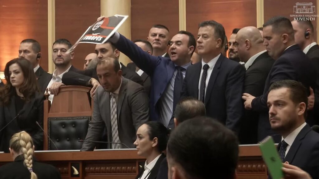Последното пленарно заседание на албанския парламент за тази година беше белязано от хаос, дебати и физически сблъсъци. Още преди началото на заседанието депутати от албанската опозиция се опитаха да седнат на местата на министрите в парламента, след което влязоха в сблъсъци с отговарящата за сигурността на висшите длъжностни лица Национална гвардия, която се опита да ги отстрани оттам. Въпреки усилията на служителите по сигурността, депутати от опозицията все пак седнаха на министерски места.