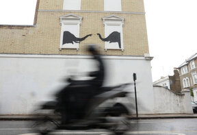 Творбата е върху стена над поредица от гаражи и е била забелязана за първи път в понеделник. Би Би Си обаче съобщи, че идентичен стенопис е видян и в петък пред висока сграда в центъра на Лондон, известна като "Сентър Пойнт" (Centre Point) , но за него няма официално потвърждение, че е на Банкси.