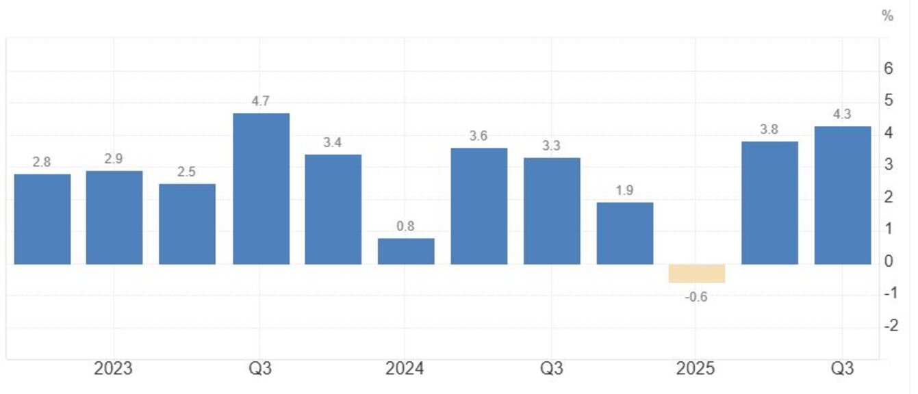 Икономиката на САЩ нарасна на годишна база с 4,3% през третото тримесечие на 2025 г., надвишавайки значително очакванията за повишение с 3,3%, показват данните на Бюрото за икономически анализи, които бяха забавени във времето заради 43-дневното спиране на работата на федералното правителство.