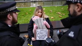 Полицията задържа демонстрант по време на протест "Вдигнете забраната" в подкрепа на "Палестинско действие" пред Министерството на вътрешните работи в Лондон, 24 ноември 2025 г.