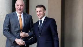 Президентът на Украйна Володимир Зеленски (вляво) и президентът на Франция Еманюел Макрон (вдясно) в Париж на Коалицията на желаещите за Украйна.