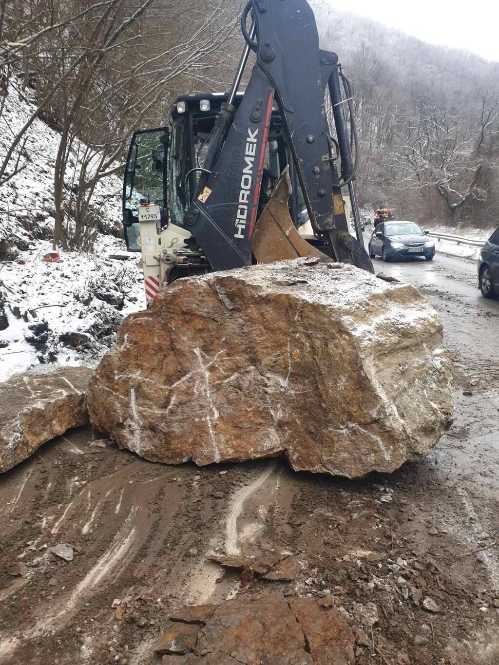Едната лента за движение разчистена. Седем машини работят по разчистването на падналата скална маса, а с помощта на 30-тонен верижен багер земната маса се товари на камиони и се извозва.