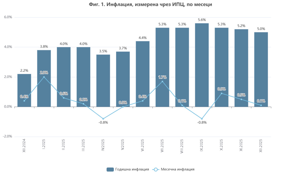 Инфлацията в България продължи да забавя леко темпа си на растеж през декември 2025 г. до 6-месечно дъно от 5,0% спрямо 5,2% през ноември, показват последните данни на Националния статистически институт.