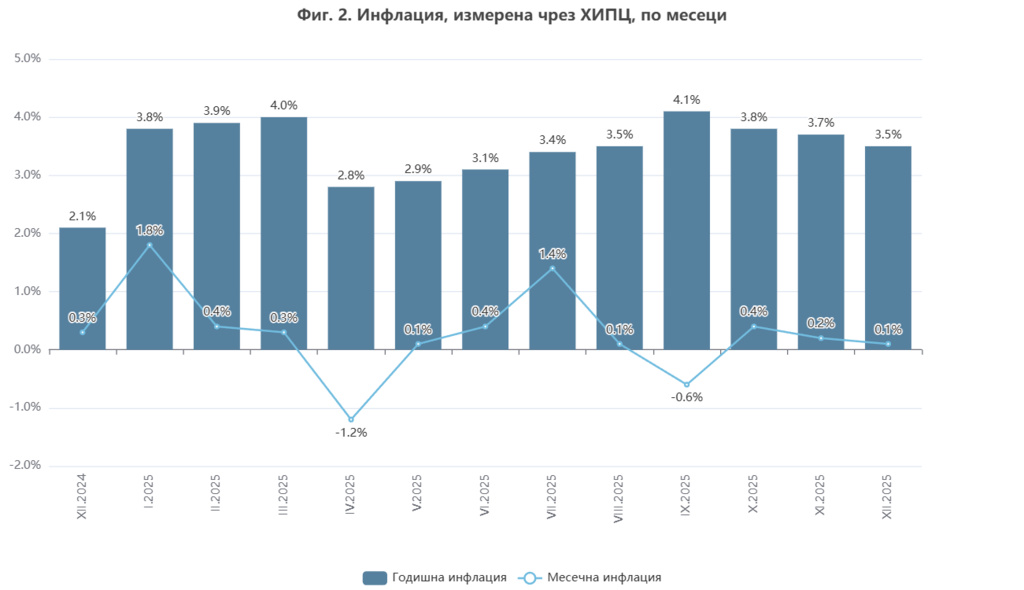 Хармонизираната инфлация (индексът HICP според общите европейски стандарти) през декември също се повишава с 0,1% на месечна база, докато хармонизираната потребителска инфлация на годишна база се забавя до 3,5% от 3,7% през ноември.