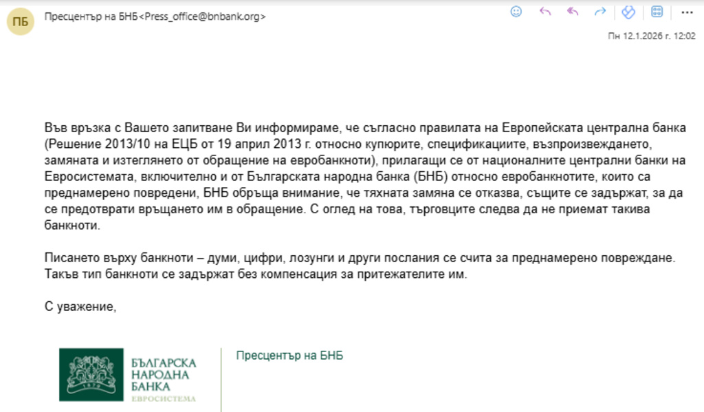 Относно писането върху евробанкнотите от екипа на “БНР - Проверка на факти” потърсихме за коментар Българска народна банка, който в понеделник (12.01.2026г.) изпратиха позиция до програма “Хоризонт” по темата: