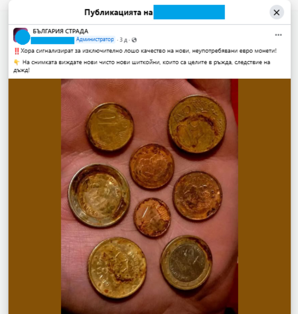 Онлайн общността реагира разнопосочно и на друга снимка, споделяна от различни профили - на монети с различен номинал, покрити с ръжда, описвани като “старо евро” с “изключително лошо качество”, както и с ирония “нови, неупотребявани”: