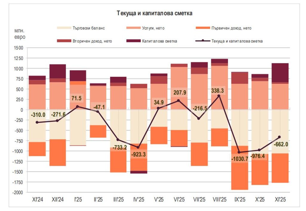 Балансът по текущата и капиталова сметка на България през ноември 2025 г. е отрицателен и в размер на 662 млн. евро при дефицит от 310 млн. евро точно преди година, като през първите единадесет месеца на изминалата година дефицитът в размер на 3,9366 млрд. евро при положително салдо от 668,2 млн. евро през периода януари - ноември 2024 г.