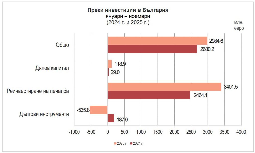 Преките чуждестранни инвестиции (ПЧИ) в страната нараства през ноември 2025 г. с 410,5 млн. евро, при тяхно повишение с 249,4 млн. евро през ноември година по-рано, като през първите единадесет месеца на изминалата година година ПЧИ се увеличават с 2,9846 млрд. евро след тяхно повишение с 2,6802 млрд. евро през същия период на 2024 г.