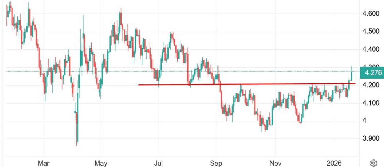 Доходността по 10-годишните американски достигна по-рано днес 4,304% - най-високата от септември 2025 г. насам, като това повишение е факт въпреки трите намаления на лихвите от страна на Федералния резерв през този период.