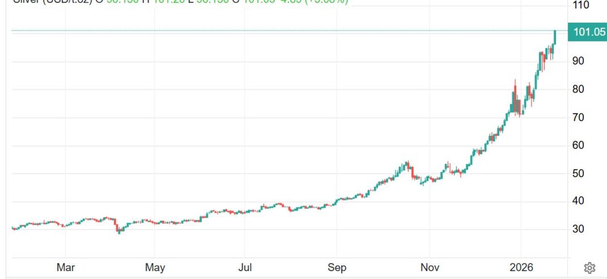 Среброто поскъпна с 5%, пробивайки за пръв път над 100 долара за тройунция и достигайки нов рекорден връх към 101,14 долара. В подкрепа на продължаващото възходящо рали на благородния метал е отслабването на щатския долар на валутния пазар, продължаващото геополитическо напрежение, по-широката икономическа несигурност и увеличеното индустриално търсене на сребро.