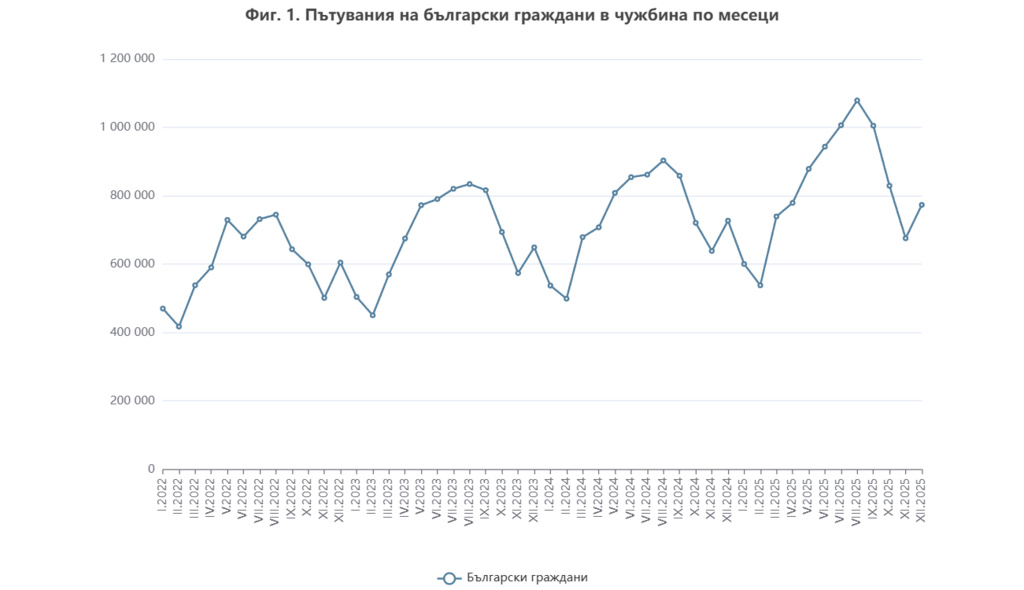 Пътуванията на български граждани в чужбина през декември са 773,3 хил., или с 6,3% над регистрираните през същия месец на 2024 г.