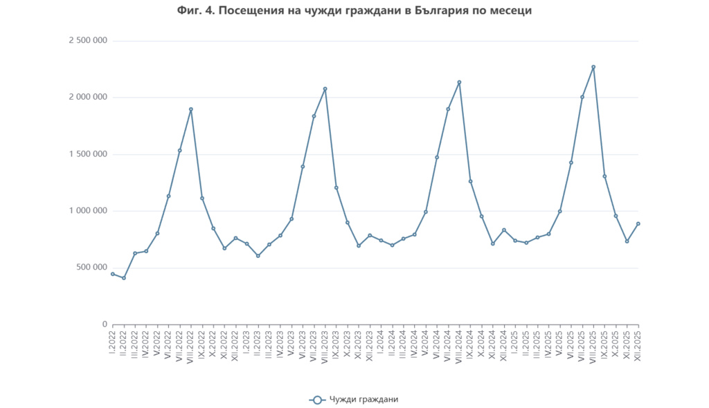 В същото време нашата страна е посетена от 888,4 хил. чужденци, или с 6,6% повече спрямо октомври 2024 г., когато те се увеличиха с едва 2,9 на сто. Транзитните преминавания през страната са 30,2% (267,9 хил.) от всички посещения на чужденци в България през ноември.