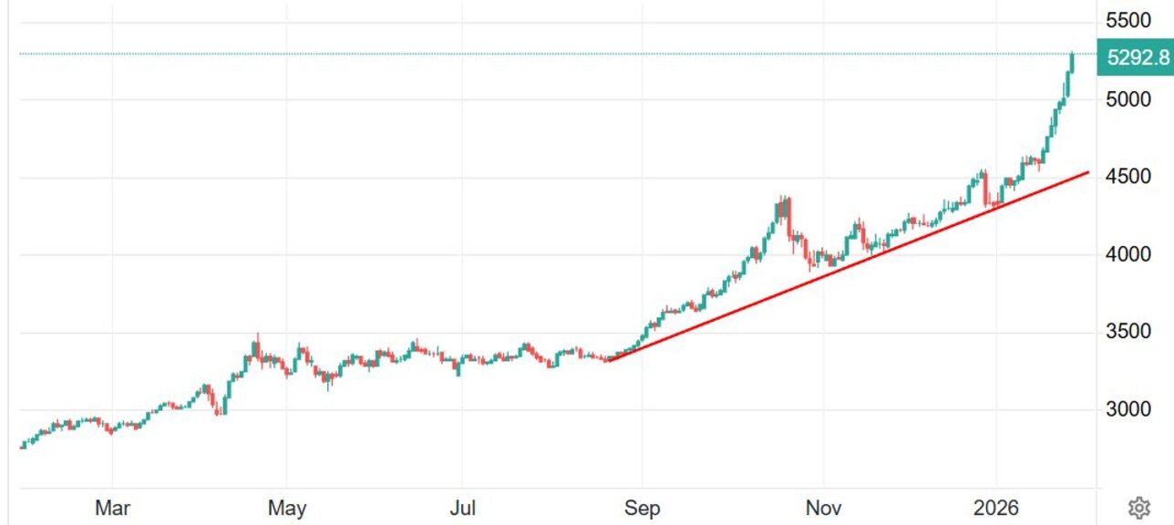 Златото поскъпна на спот пазар до нов рекорден връх над 5300 долара за тройунция, продължавайки главоломното си възходящо рали, подхранвано от слабостта на щатския долар и бягството от държавни облигации и валути заради геополитическите рискове, което продължава да поддържа статута му на "инвестиционно убежище".