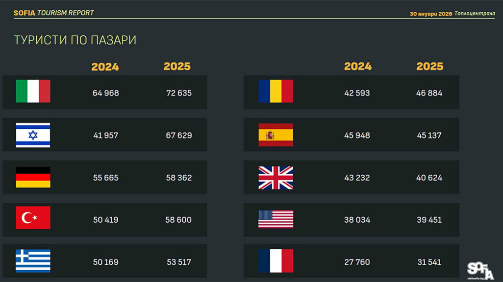 Броят на туристите, посетили София, се е увеличил с 9% за последната календарна година спрямо предходната 2024-та. Отчетените нощувки надхвърлят 3,06 милиона.