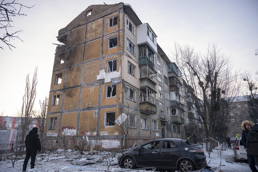 Ударена от руски дронове сграда в Киев, Украйна, 3 февруари 2026 г.