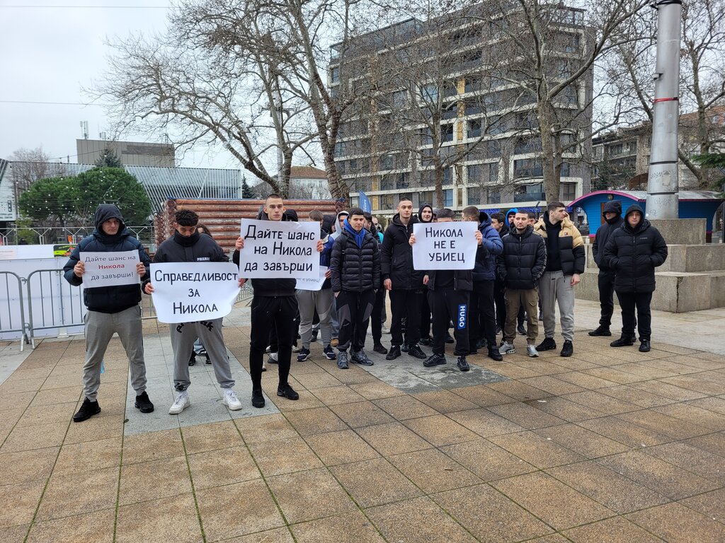 Съученици и приятели на обвиняемия Никола Бургазлиев протестираха в негова подкрепа пред съдебната палата. Те издигнаха плакати с надписи "Дайте шанс на Никола да завърши" и "справедливост за Никола".