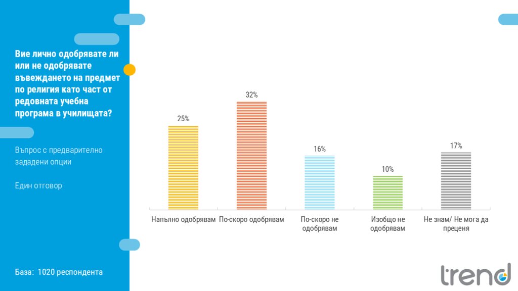 Според социологическо проучване на Агенция "Тренд", 57% от анкетираните българи одобряват въвеждането на предмет "религия" в българското общообразователно училище. От същото изследване става ясно, че за българските ученици най-върховата ценност в момента е материалното благосъстояние на техните семейства. За някои анализатори това е симптоматичен сигнал, че духовното образование е наложително.