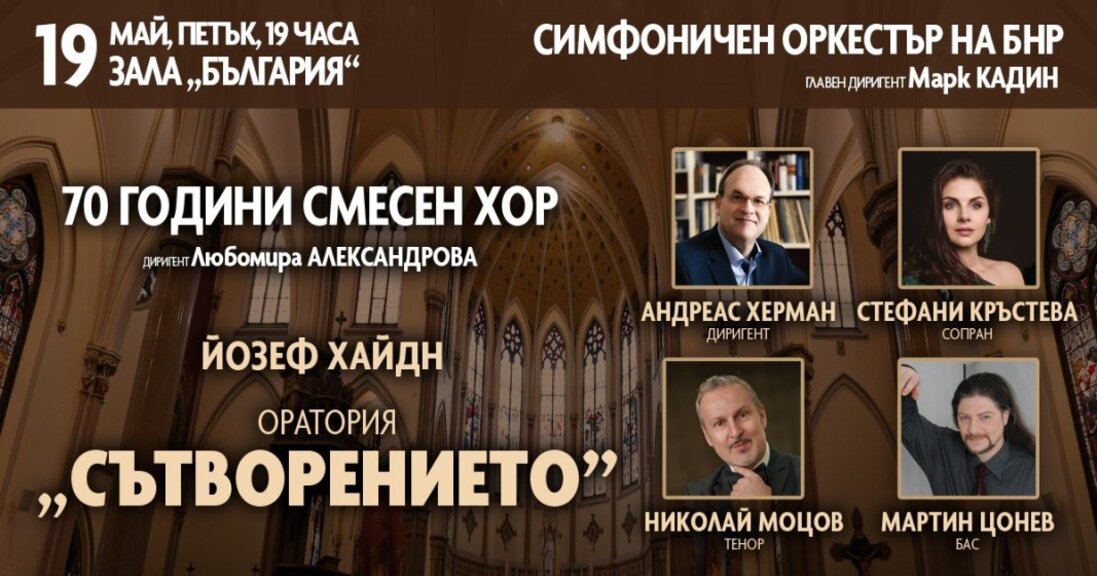 На 19 май от 19 часа в зала „България“ Симфоничният оркестър и Смесеният хор на БНР ще представят един от ораториалните шедьоври на Хайдн - „Сътворението“. Ораторията е композирана през 1795 г. по либрето, разказващо историята на юдео-християнското сътворение, както е описано в епичната поема на Джон Милтън „Изгубеният рай“. Хайдн се съгласява с предложението на своя покровител, барон Готфрид Фрайхер ван Свитен, завеждащ императорската придворна библиотека във Виена, произведението да бъде поставено на немски език, задача, която баронът поема лично. Хайдн дирижира премиерата на ораторията в двореца Шварценберг във Виена.